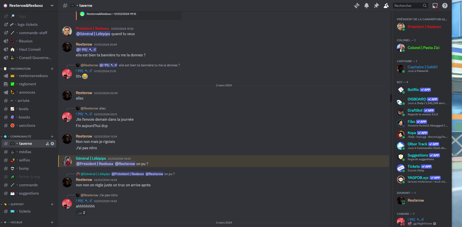 Vous pouvez venir en vocal avec vos amis et parlez de tout et de rien tant que ça ne dépasse pas les limites du règlement.